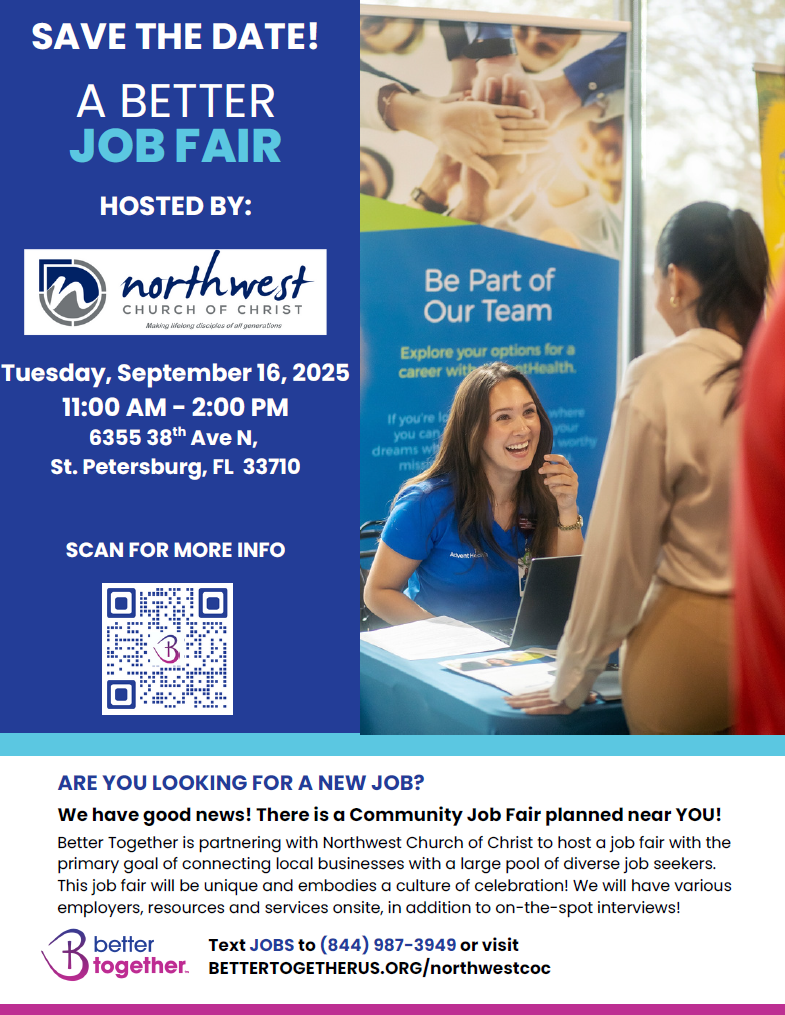 Back to All Events A Better Job Fair Tuesday, September 16, 2025 11:00 AM 2:00 PM Northwest Church of Christ 6355 38th Avenue North St. Petersburg, FL, 33710 United States (map) Google Calendar ICS